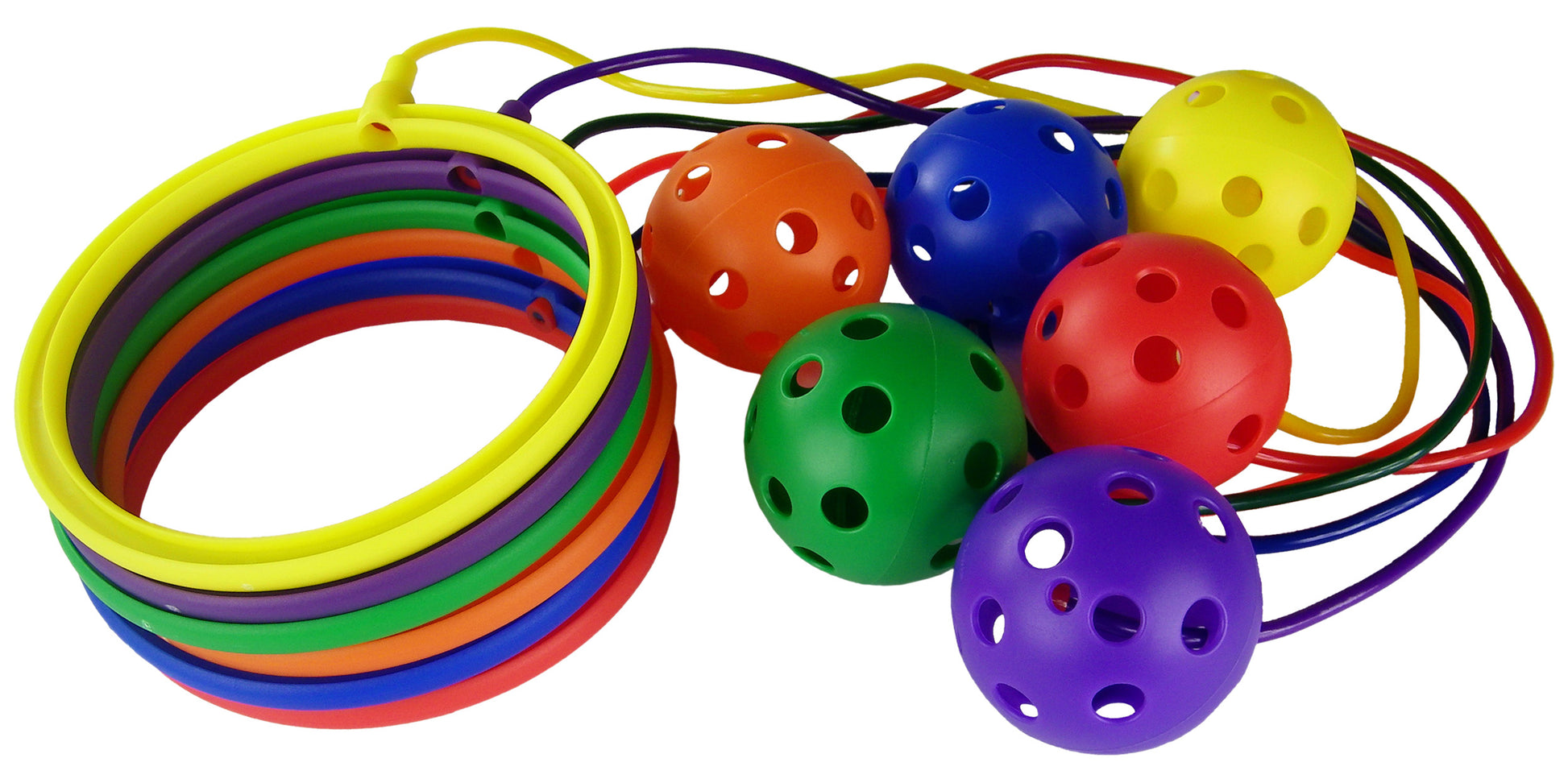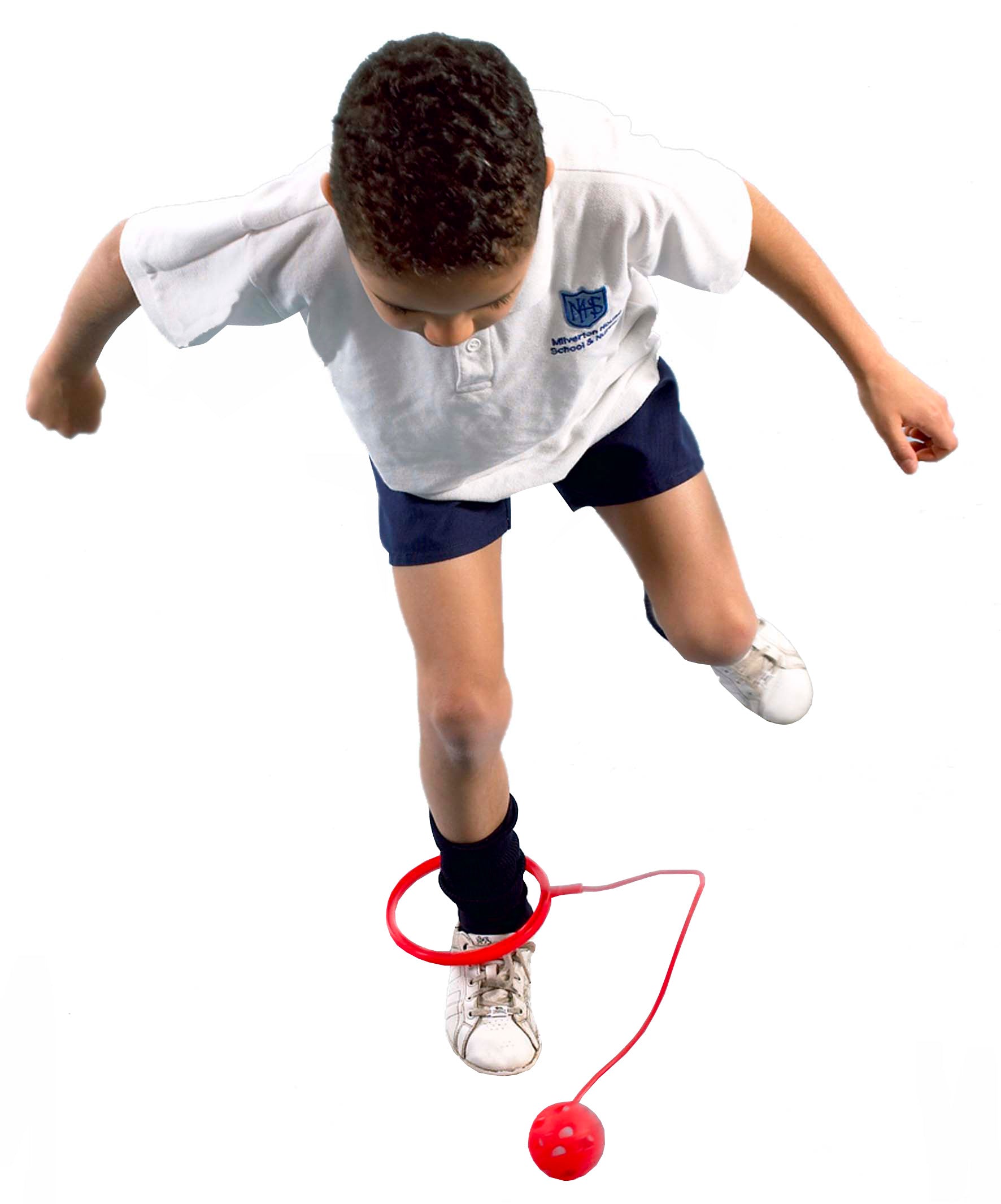 Airflow style ball attached to plastic ankle ring with PVC rope